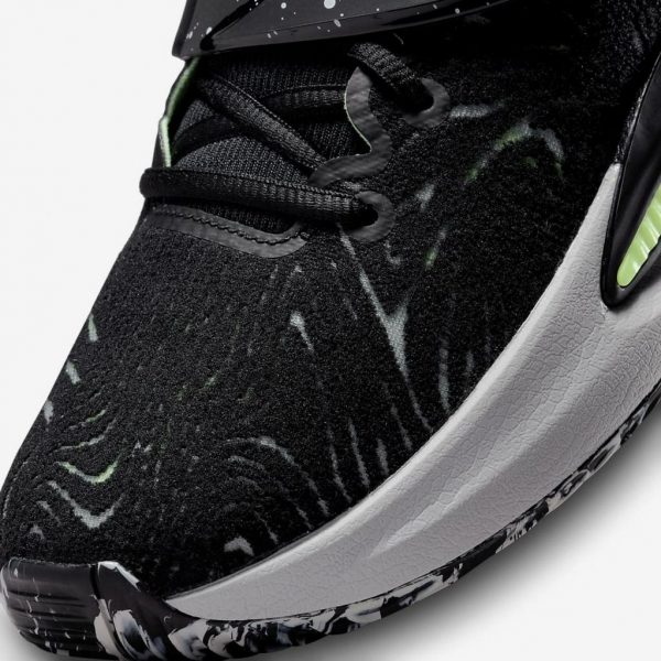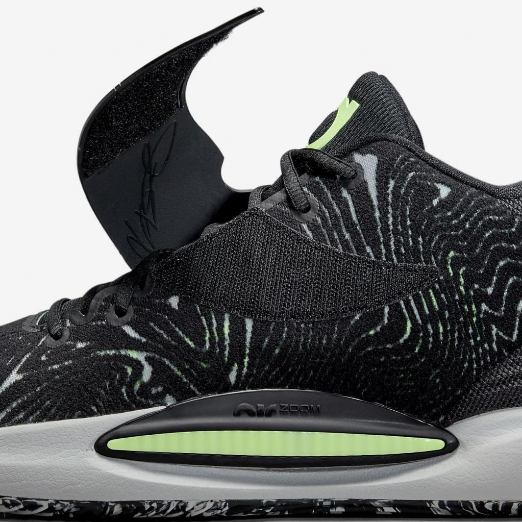 En burrebåndslukning går over toppen af snørebåndene for støtte og en sikker pasform. Det er en diskret hyldest til stroppen på KD4 kombineret med inspiration fra en Grim Reaper-leen.