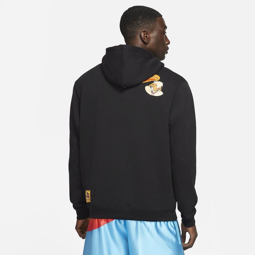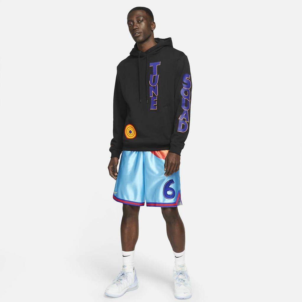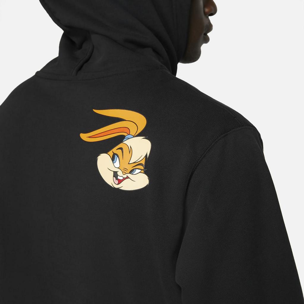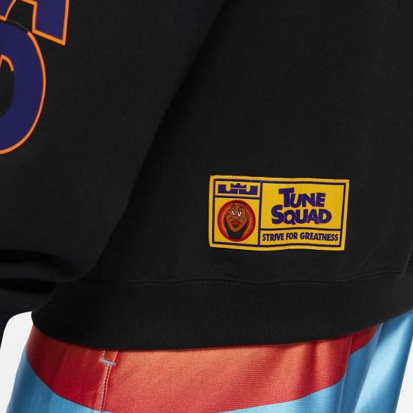 Puff print-grafik med "Tune Squad" ned over brystet og ærmet, Looney Tunes-skydeskive og Lola Bunny bag på skulderen.Der er også et broderet LeBron finger-roll-kronelogo og et påsyet Tune Squad-mærke.