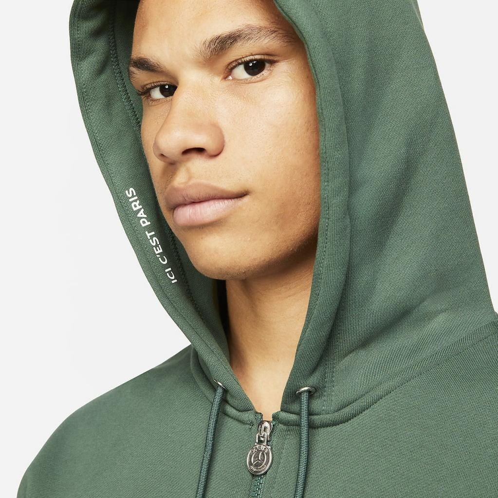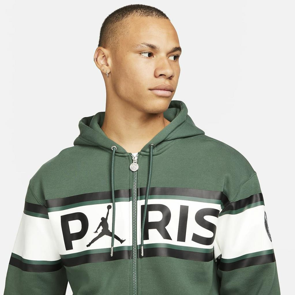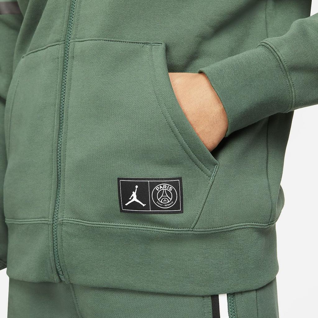 Snoretrækshuller, snoretræksender og lynlåsstropperne er brandet med Jordan x Paris Saint-Germain-logoer. Klubemblem, logomærke, print og broderi viser samarbejdet.