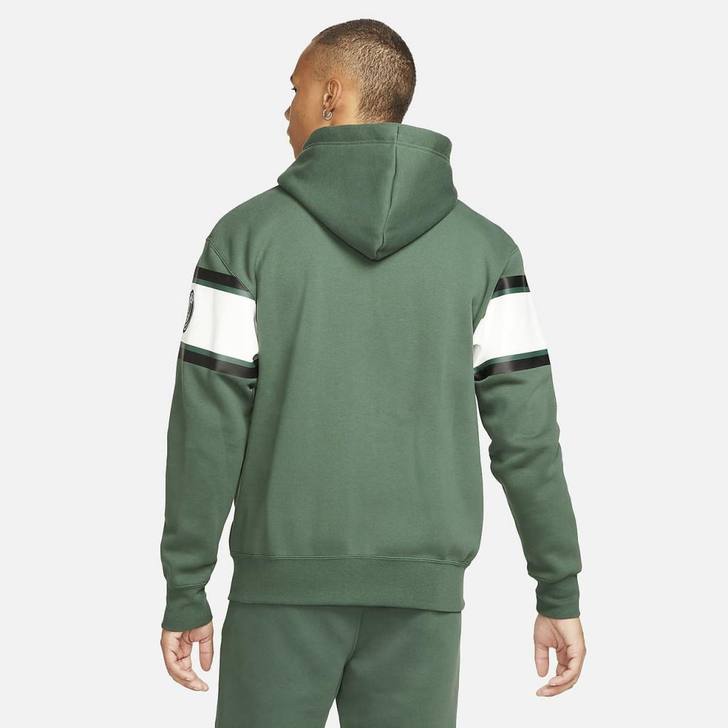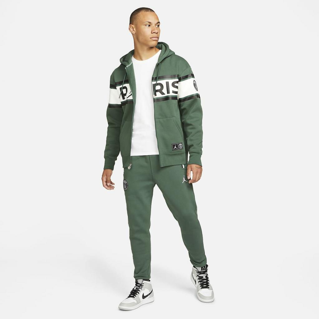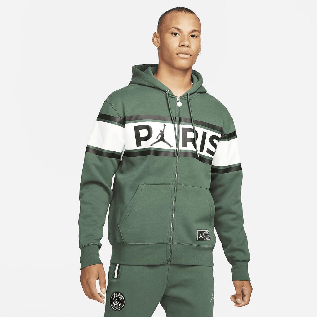 Snoretrækshuller, snoretræksender og lynlåsstropperne er brandet med Jordan x Paris Saint-Germain-logoer. Klubemblem, logomærke, print og broderi viser samarbejdet.