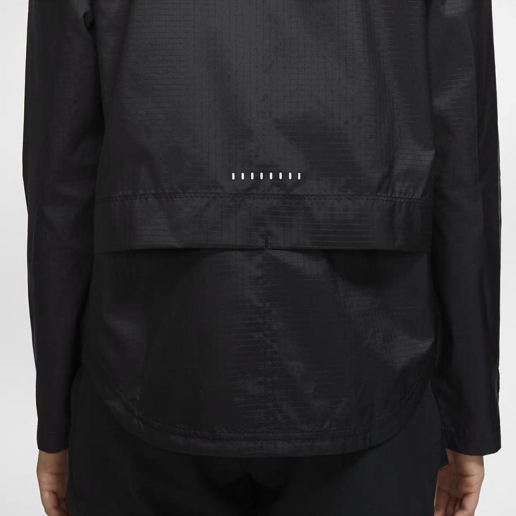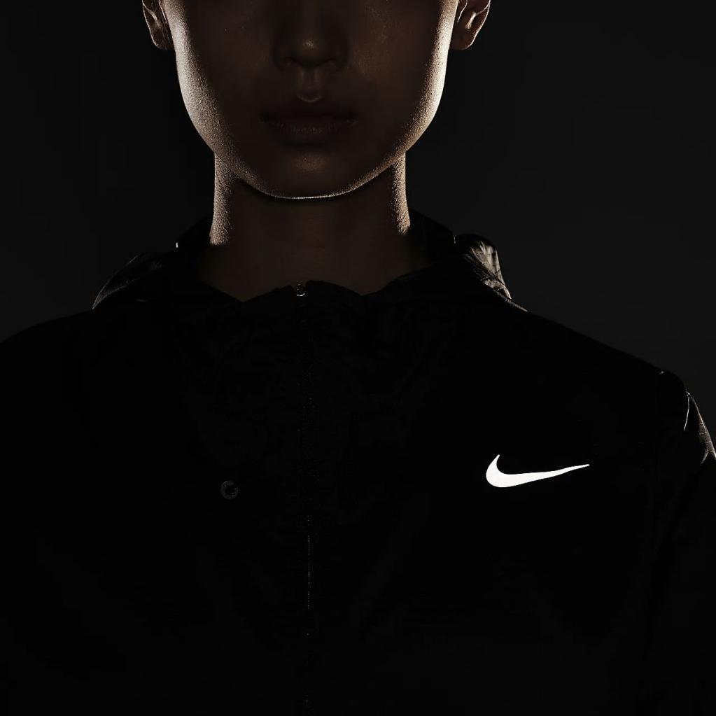 Nike Essential-løbejakken hjælper med at holde dig i gang, når det bliver vådt. Vandafvisende materiale kombineres med hættens tildækning for at holde dig tør på løbeturen.