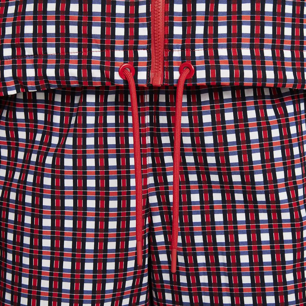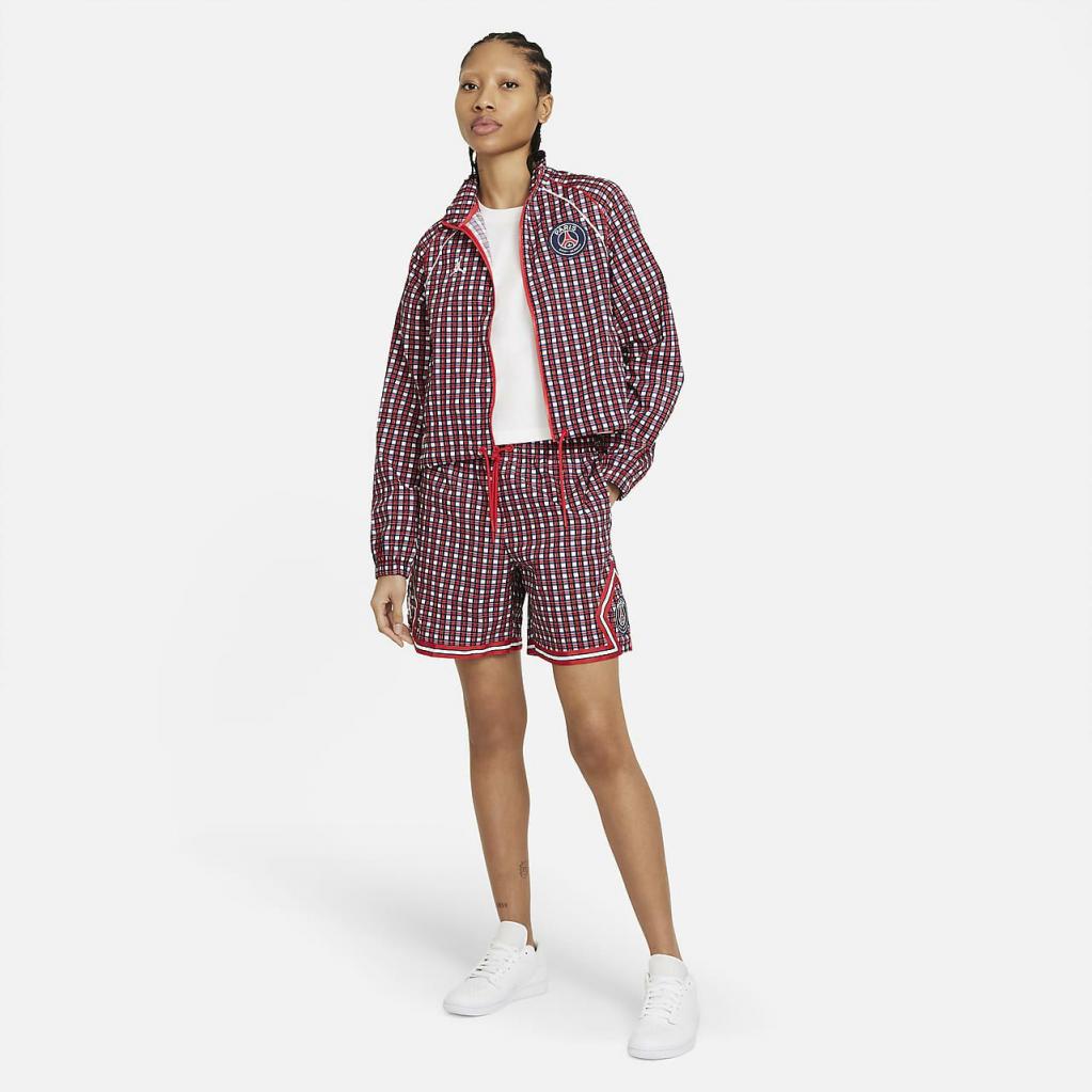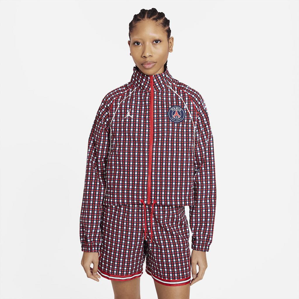 Den vævede Paris Saint-Germain-jakken er et friskt bud på farverne fra klubbens home-sæt. Den er fremstillet i let, vævet materiale, der skiller sig ud med et heldækkende skotskternet print. Tyk, snørelignende kantning og et påsyet emblem tilføjer et high-end touch.