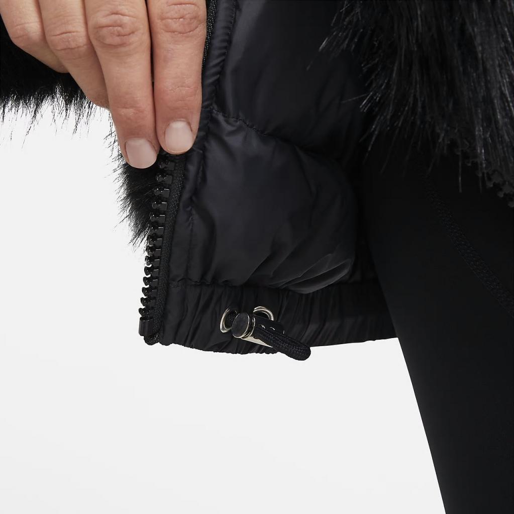 Imiteret pelsmateriale i hætten, manchetter, den nederste del og bagpå ærmerne er blandet med nylon for at give behagelig varme.