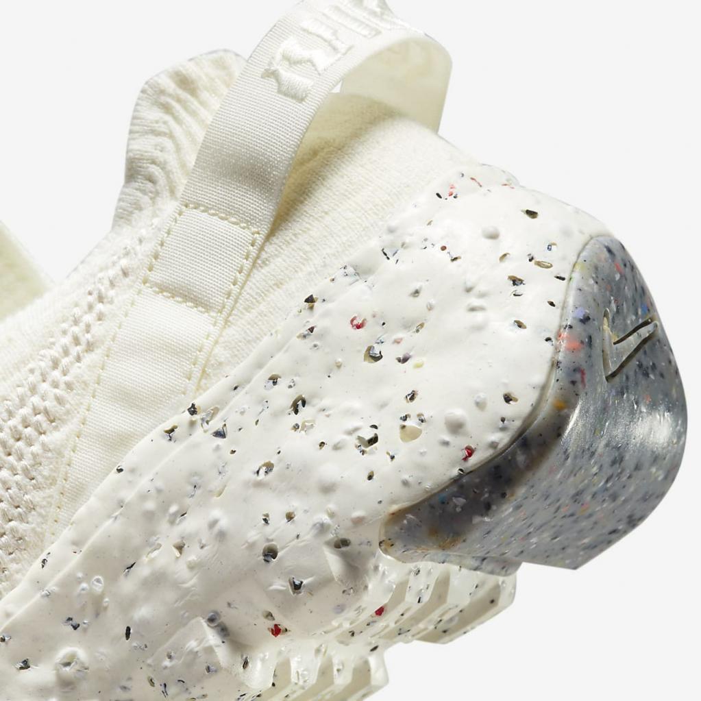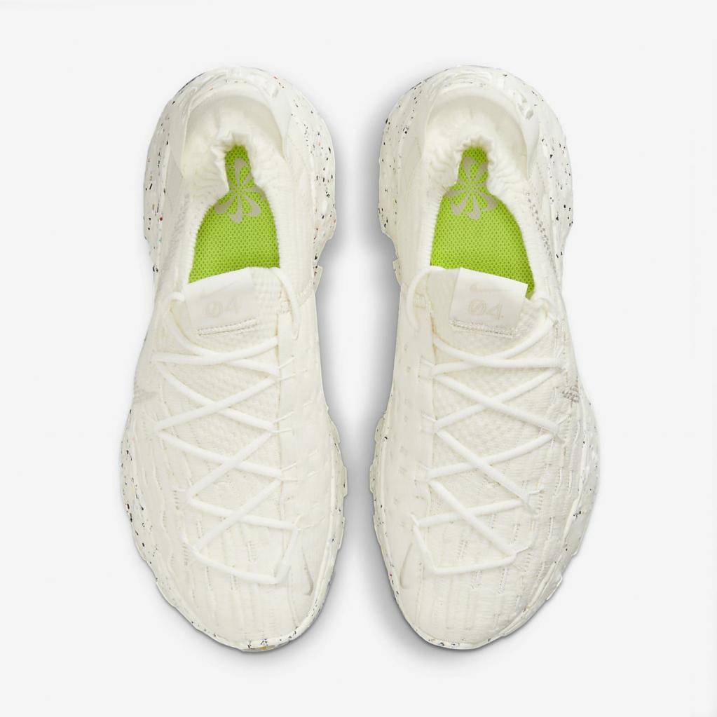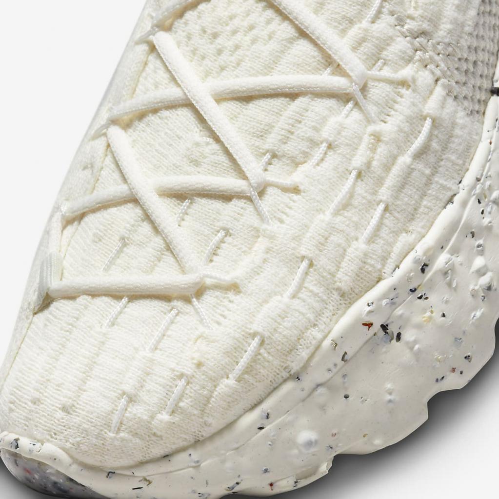 Space Hippie er historien om transformering af affald. Space Hippie 04 er lavet af mindst 25% genbrugsmateriale efter vægt fra overdelen til ydersålen. Det er den letteste silhuet i kollektionen, og den har også den laveste CO2-belastning. Overdelen i "Space Waste-tråd" indeholder omkring 75% genanvendt indhold i vægt, der er fremstillet fra genanvendte plastflasker, T-shirts og trådrester. En blød Crater-skummellemsål kombinerer Nike Grind med en blanding af skum, som giver stabilitet og en unik æstetik.