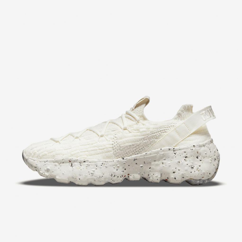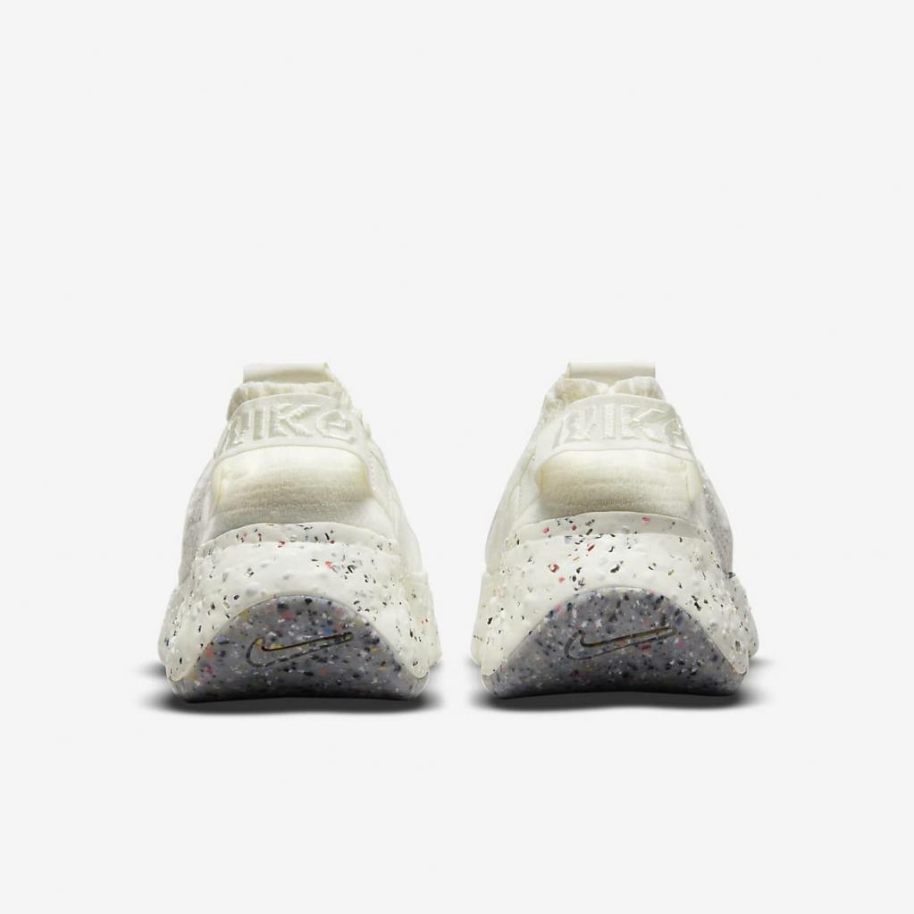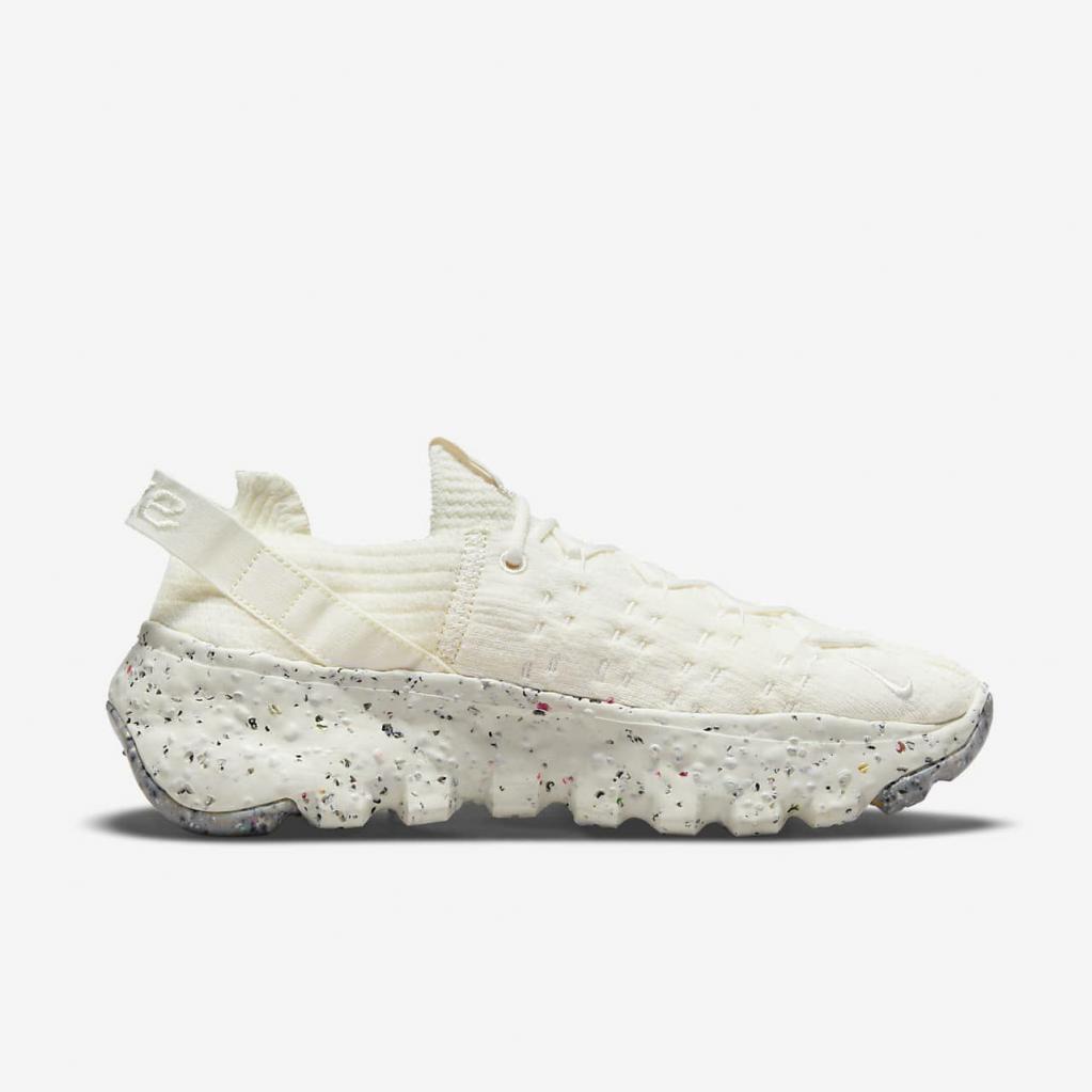Space Hippie er historien om transformering af affald. Space Hippie 04 er lavet af mindst 25% genbrugsmateriale efter vægt fra overdelen til ydersålen. Det er den letteste silhuet i kollektionen, og den har også den laveste CO2-belastning. Overdelen i "Space Waste-tråd" indeholder omkring 75% genanvendt indhold i vægt, der er fremstillet fra genanvendte plastflasker, T-shirts og trådrester. En blød Crater-skummellemsål kombinerer Nike Grind med en blanding af skum, som giver stabilitet og en unik æstetik.