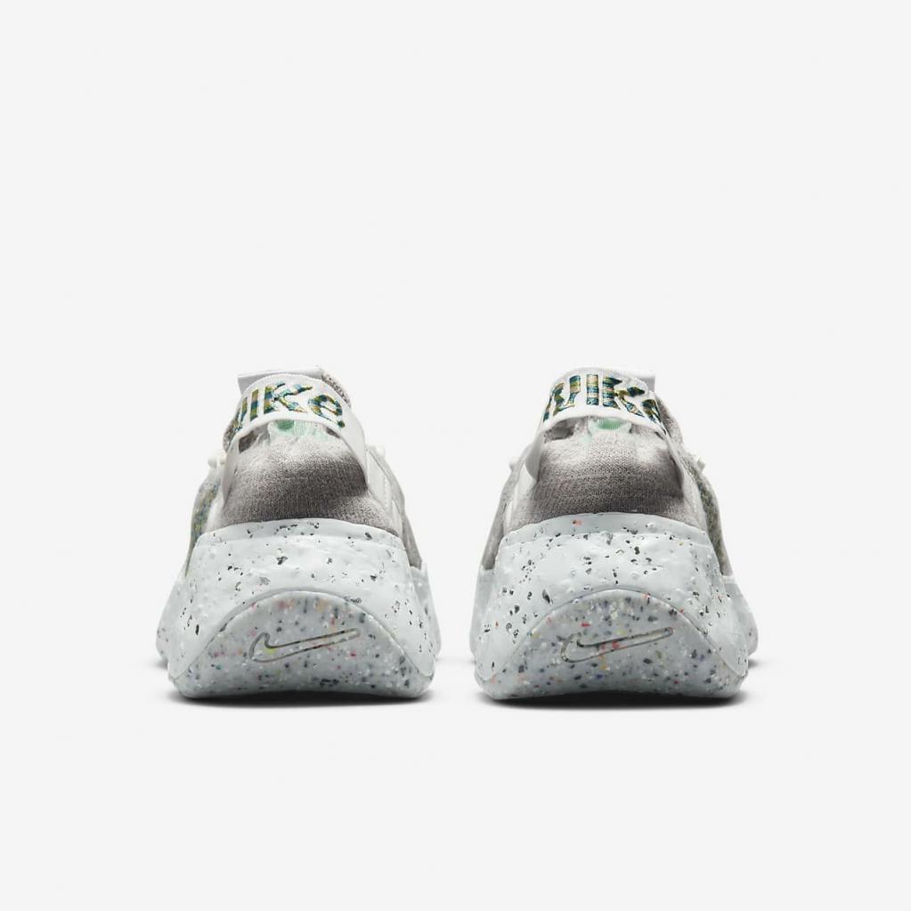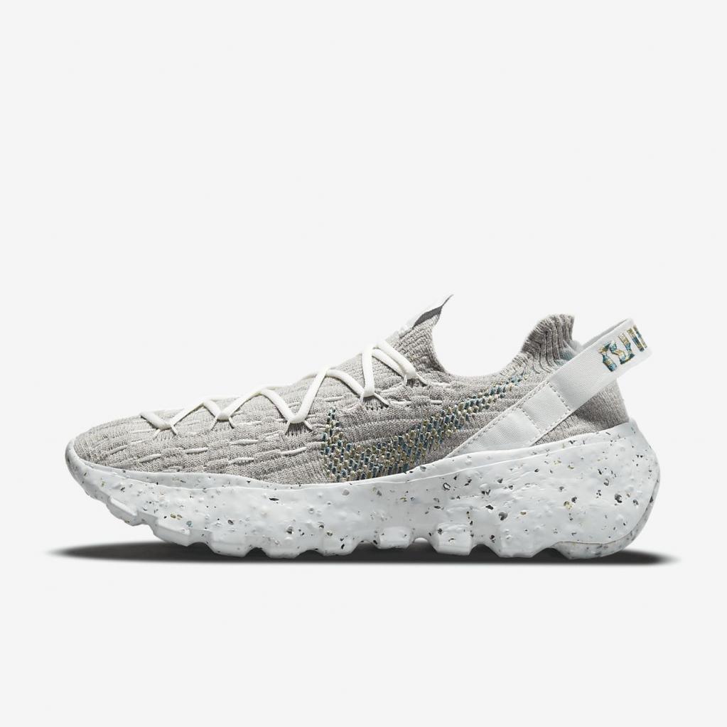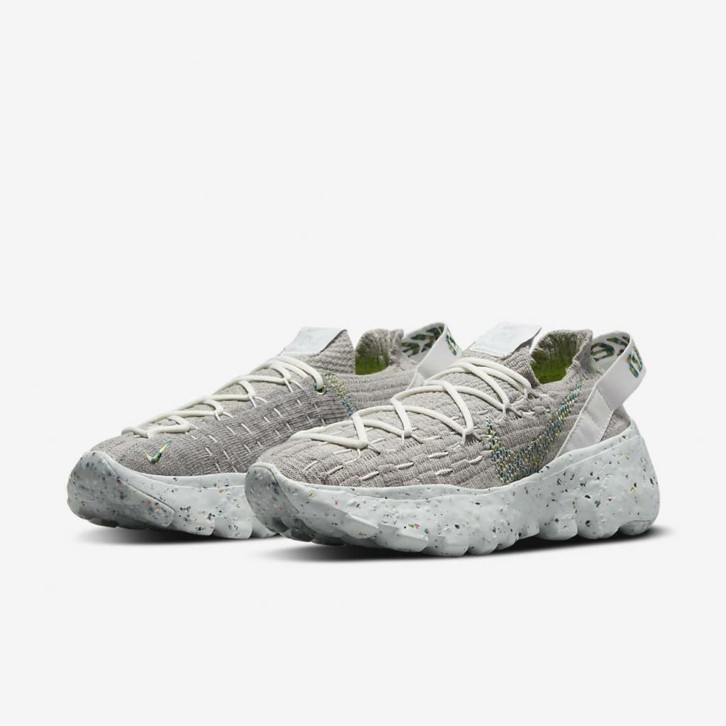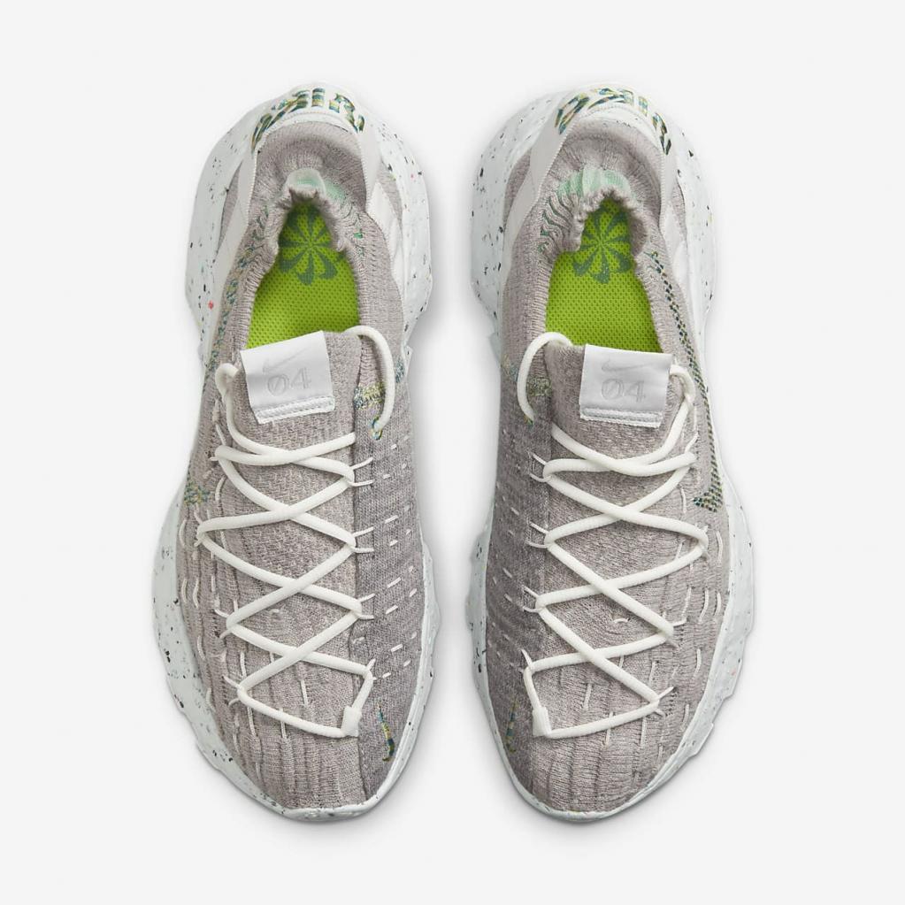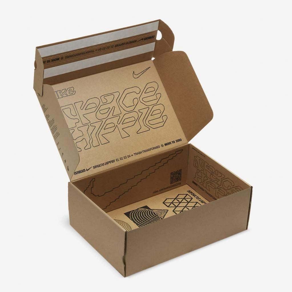 Space Hippie er historien om transformering af affald. Space Hippie 04 er lavet af mindst 25% genbrugsmateriale efter vægt fra overdelen til ydersålen. Det er den letteste silhuet i kollektionen, og den har også den laveste CO2-belastning. Overdelen i "Space Waste-tråd" indeholder omkring 75% genanvendt indhold i vægt, der er fremstillet fra genanvendte plastflasker, T-shirts og trådrester. En blød Crater-skummellemsål kombinerer Nike Grind med en blanding af skum, som giver stabilitet og en unik æstetik.