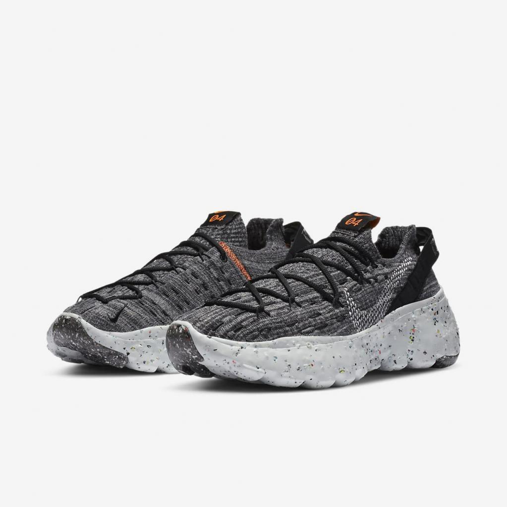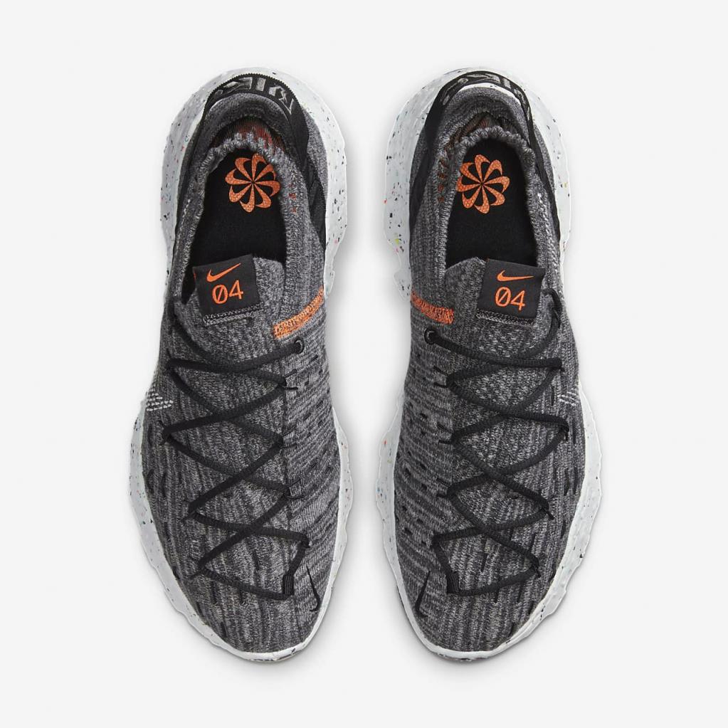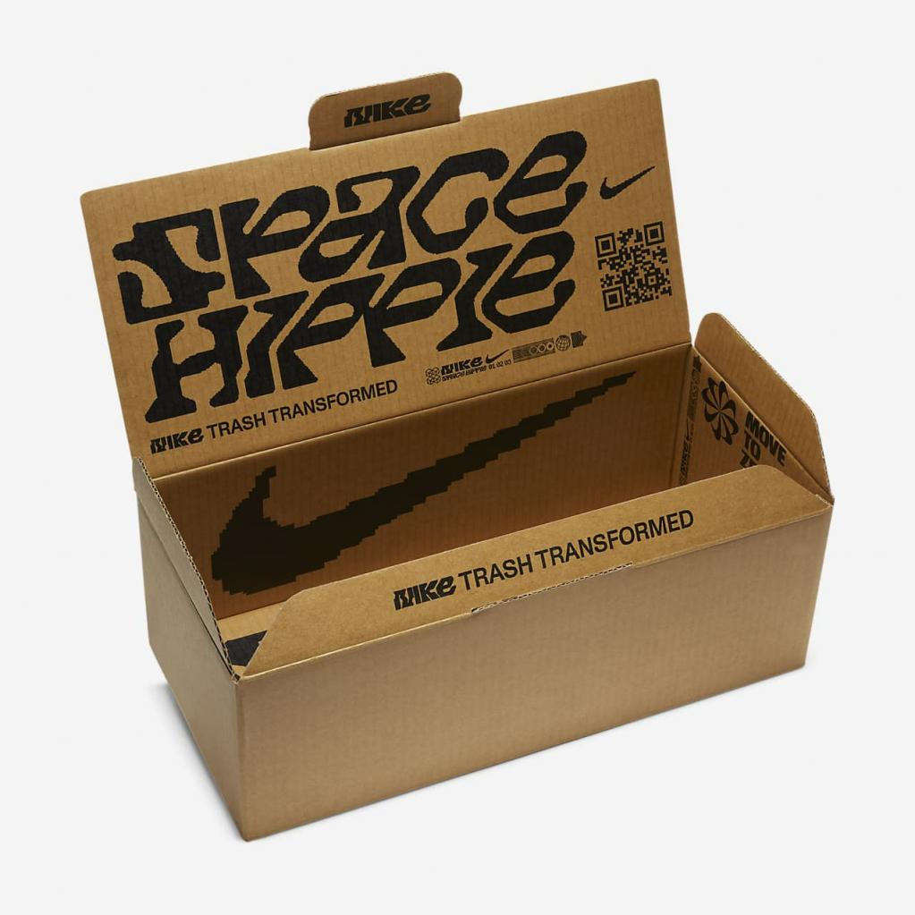 Space Hippie er historien om transformering af affald. Space Hippie 04 er lavet af mindst 25% genbrugsmateriale efter vægt fra overdelen til ydersålen. Det er den letteste silhuet i kollektionen, og den har også den laveste CO2-belastning. Overdelen i "Space Waste-tråd" indeholder omkring 75% genbrugt indhold i vægt, der er fremstillet fra genanvendte plastflasker, T-shirts og trådrester. En blød Crater-skummellemsål kombinerer Nike Grind med en blanding af skum, som giver stabilitet og en unik æstetik.
