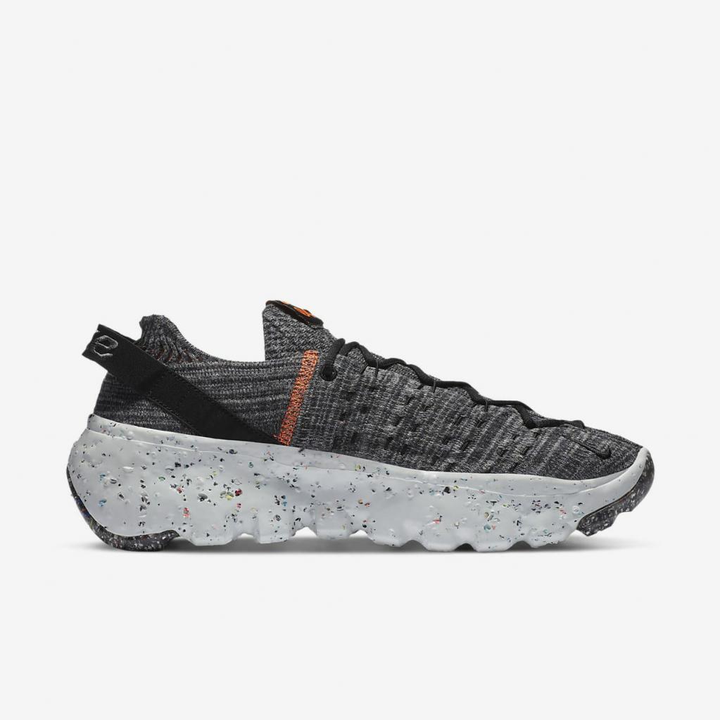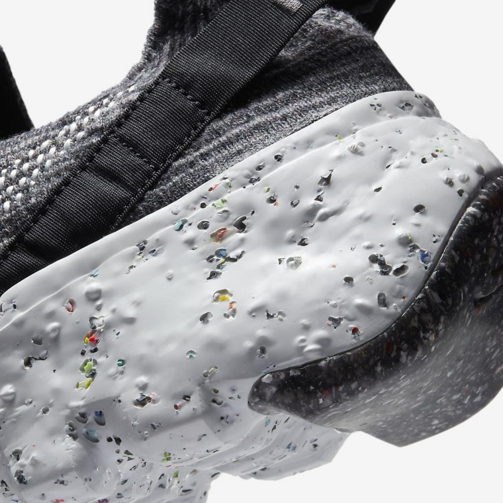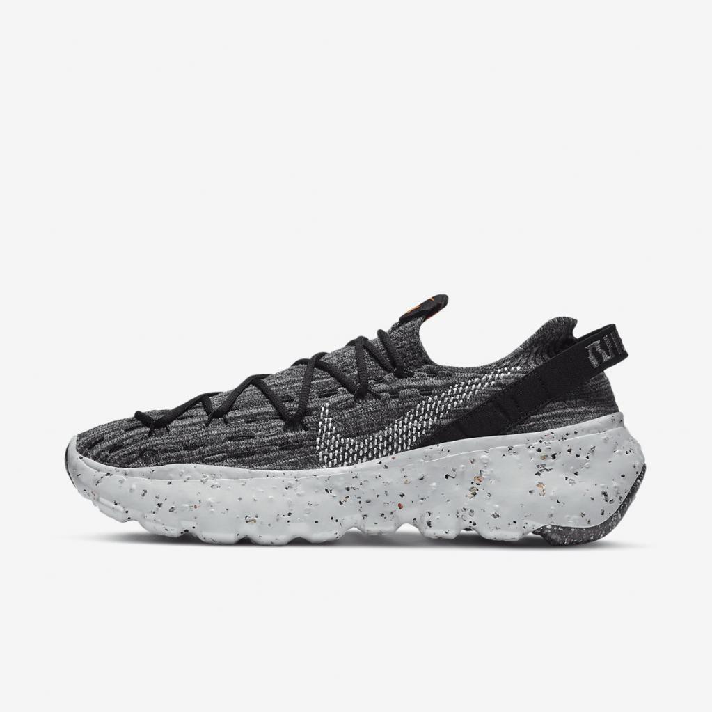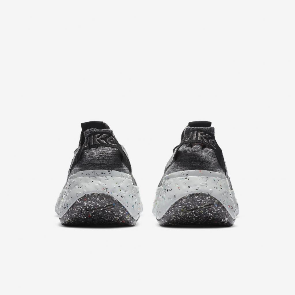 Space Hippie er historien om transformering af affald. Space Hippie 04 er lavet af mindst 25% genbrugsmateriale efter vægt fra overdelen til ydersålen. Det er den letteste silhuet i kollektionen, og den har også den laveste CO2-belastning. Overdelen i "Space Waste-tråd" indeholder omkring 75% genbrugt indhold i vægt, der er fremstillet fra genanvendte plastflasker, T-shirts og trådrester. En blød Crater-skummellemsål kombinerer Nike Grind med en blanding af skum, som giver stabilitet og en unik æstetik.