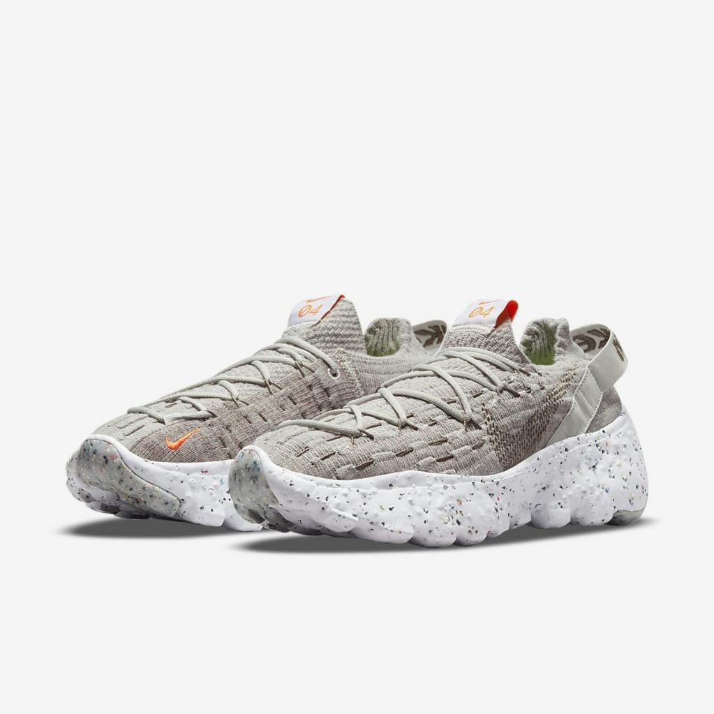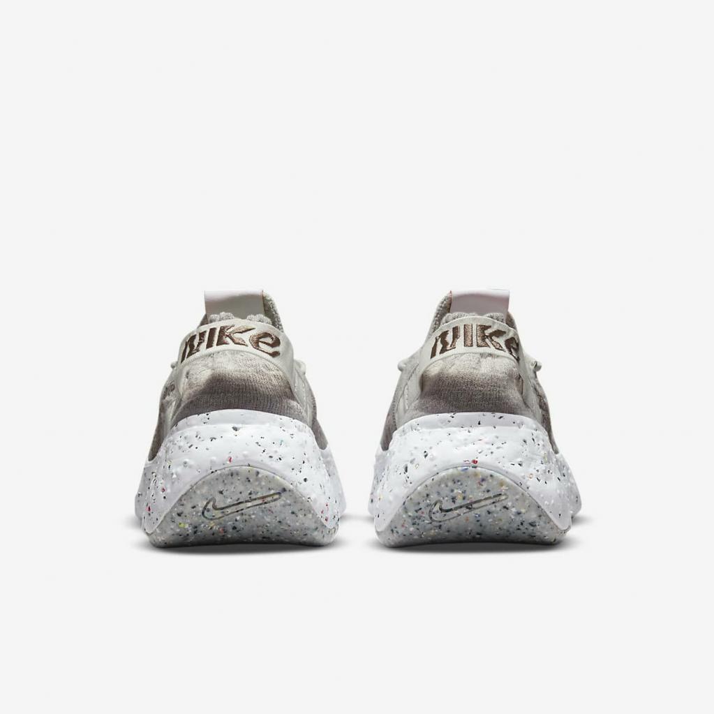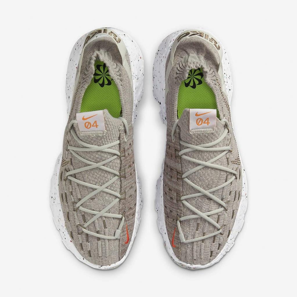 Space Hippie er historien om transformering af affald. Space Hippie 04 er lavet af mindst 25% genbrugsmateriale efter vægt fra overdelen til ydersålen. Det er den letteste silhuet i kollektionen, og den har også den laveste CO2-belastning. Overdelen i "Space Waste-tråd" indeholder omkring 75% genbrugt indhold i vægt, der er fremstillet fra genanvendte plastflasker, T-shirts og trådrester. En blød Crater-skummellemsål kombinerer Nike Grind med en blanding af skum, som giver stabilitet og en unik æstetik.