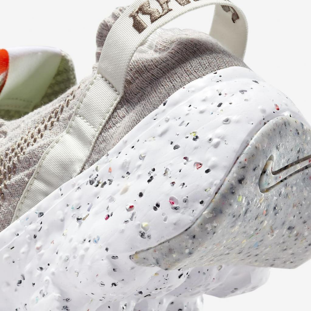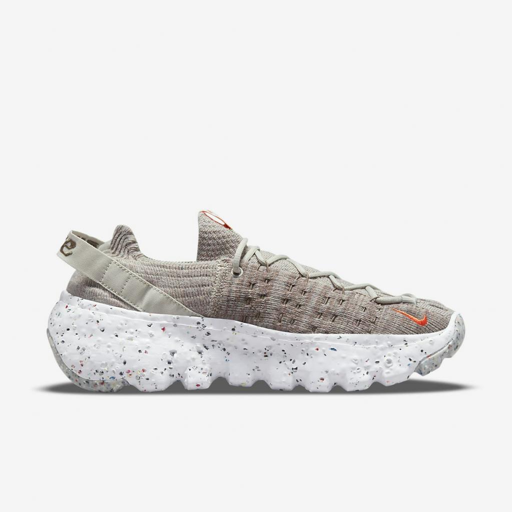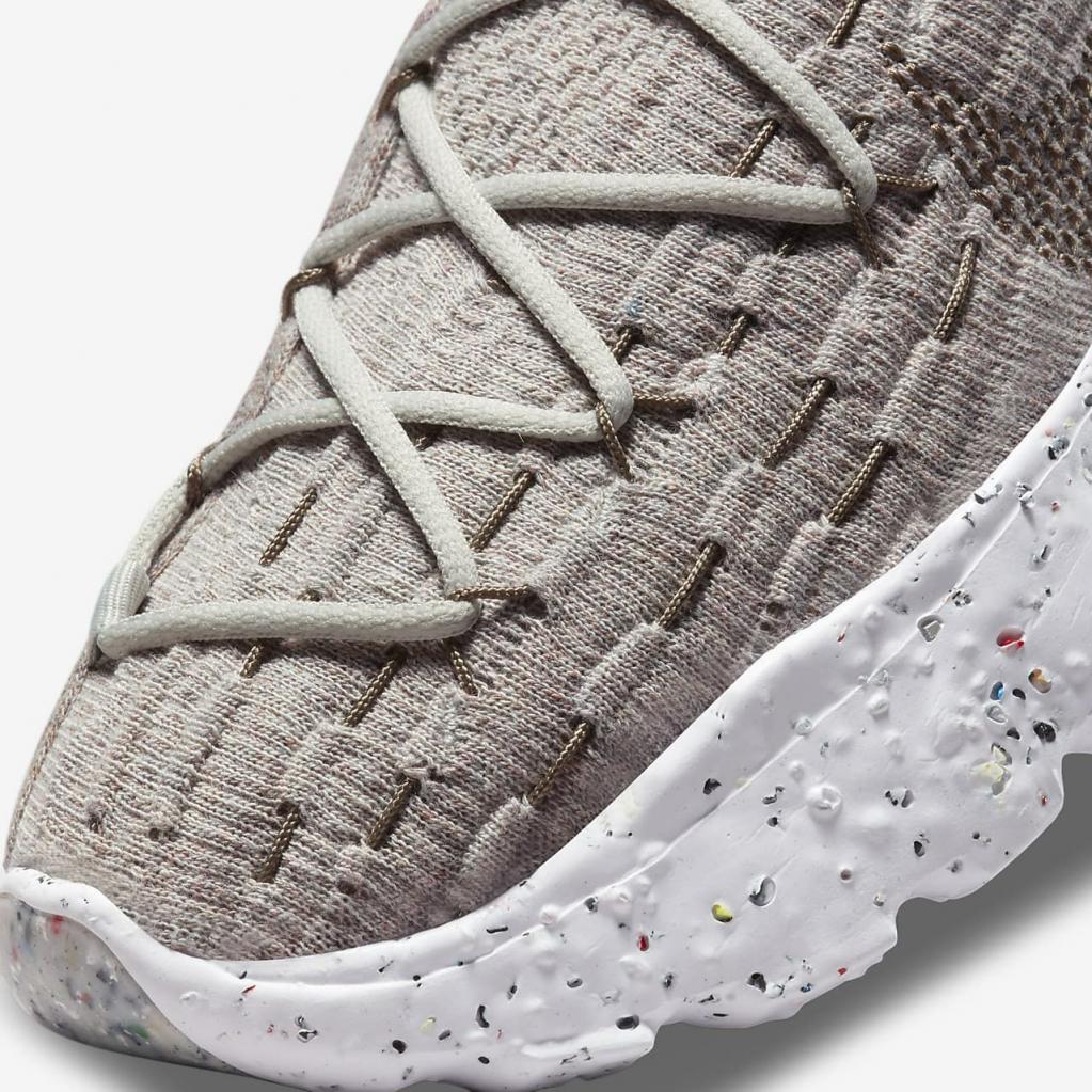 Space Hippie er historien om transformering af affald. Space Hippie 04 er lavet af mindst 25% genbrugsmateriale efter vægt fra overdelen til ydersålen. Det er den letteste silhuet i kollektionen, og den har også den laveste CO2-belastning. Overdelen i "Space Waste-tråd" indeholder omkring 75% genbrugt indhold i vægt, der er fremstillet fra genanvendte plastflasker, T-shirts og trådrester. En blød Crater-skummellemsål kombinerer Nike Grind med en blanding af skum, som giver stabilitet og en unik æstetik.