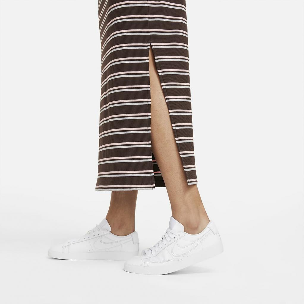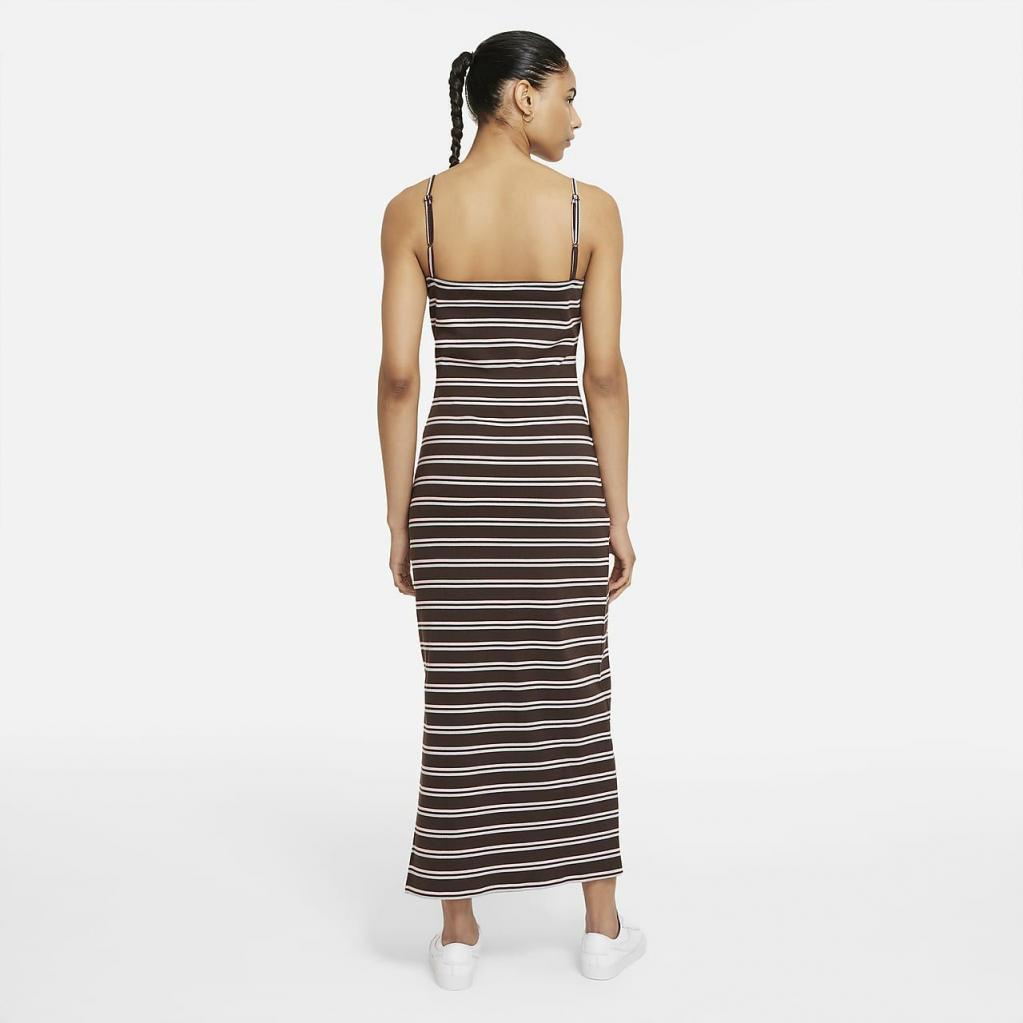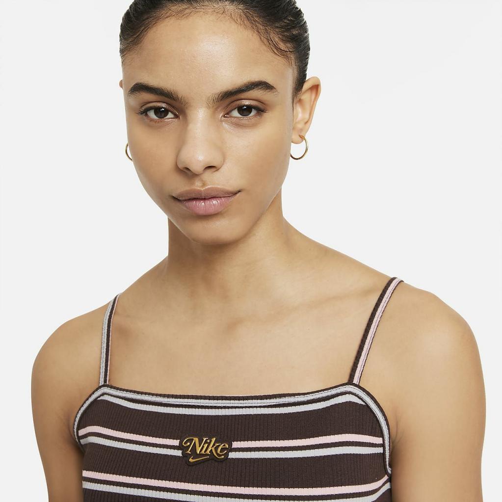 Nike Sportswear Femme-kjolen, der er inspireret af sommerstilen fra 70’erne, er en maxi-kjole, der er fremstillet i et stribet materiale i maskinstrikket rib. Tynde skulderstropper og en tætsiddende pasform giver plads til slidser i siden, så du og dine sneakers bliver vist frem.