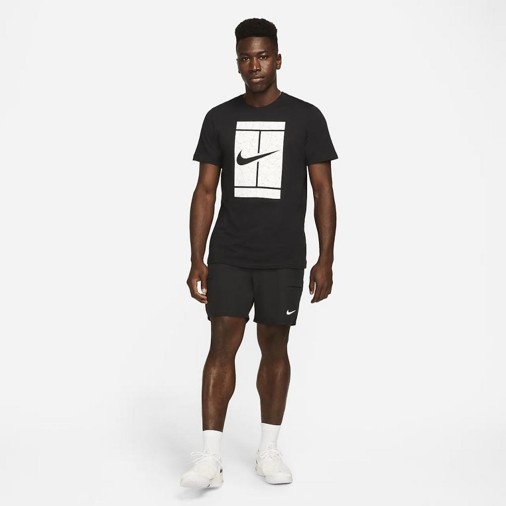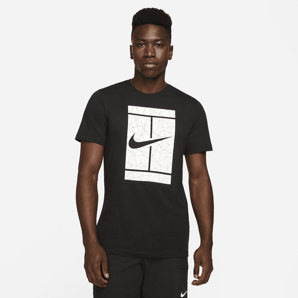 NikeCourt-T-shirten løfter en behagelig bomulds-musthave med et overdimensioneret NikeCourt-logo. Den markante, kantede grafik på indersiden af logoet er inspireret af banens geometriske linjer.