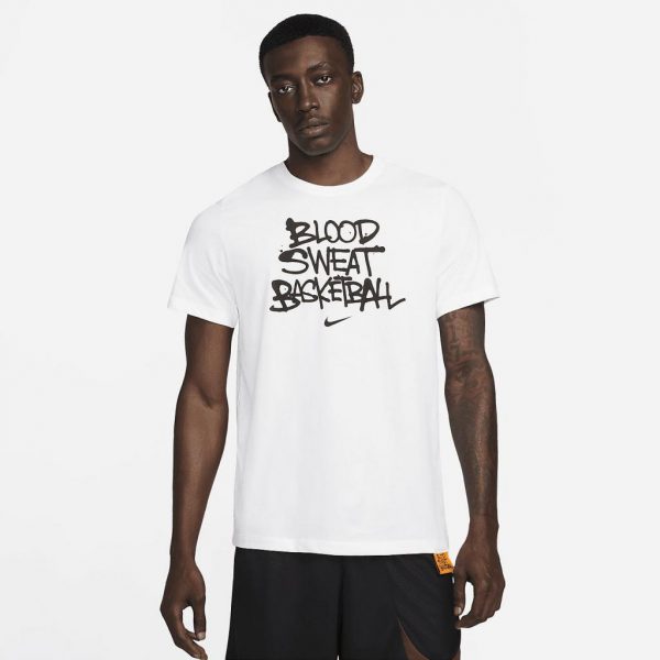 Vis din dedikation til spillet i Nike Dri-FIT "Blood, Sweat, Basketball"-T-shirten. Det lette og bløde materiale med svedtransporterende teknologi hjælper med at holde dig komfortabel.